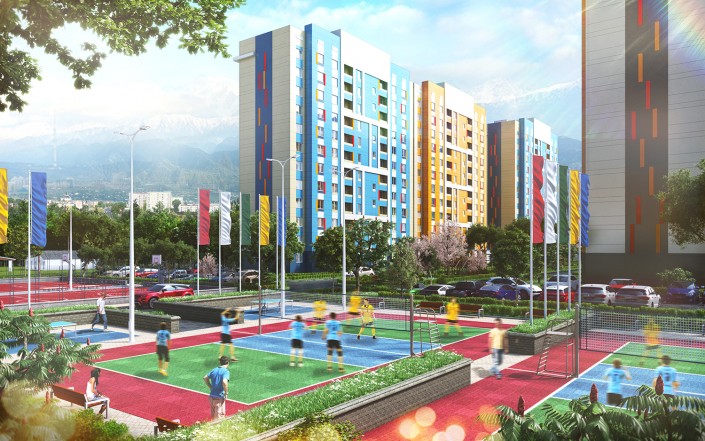 На территории жилого района строится детский сад, а рядом - новая школа. Просторные благоустроенные дворы предполагают места для отдыха, детские и спортивные площадки. Вдоль жилого района "Алмалы" уже ведется благоустройство - высаживается великолепная тенистая аллея с уже взрослыми деревьями и декоративными кустарниками. Из окон 12- и 14-этажных домов открывается великолепный вид на горы.