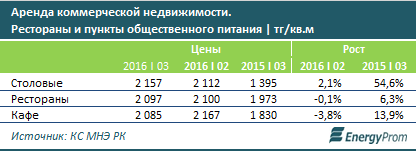 "Относительно кафе наблюдалось снижение на 3,8 процента, до 2085 тенге за квадратный метр, рестораны также ушли в минус на 0,1 процента, до 2097 тенге за квадратный метр. В плюсе лишь столовые - рост составил 2,1 процента, до 2157 тенге за квадратный метр.Столовые показали и самый значительный годовой рост - более чем в полтора раза (на 54,6 процента). Цена аренды квадратного метра в сегменте обогнала цены кафе и ресторанов. Арендная цена квадратного метра в кафе за год выросла на 13,9 процента, а в ресторанах - на 6,3 процента", - говорится в распространенном сообщении.