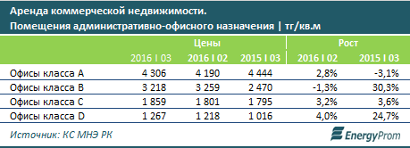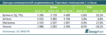 "Снижение арендных цен относительно февраля 2016 года отмечено в сегменте офисов класса В - минус 3,1 процента, до 3218 тенге за квадратный метр. Цены на аренду торговых помещений в марте 2016 года в сравнении с февральскими снизились практически во всех сегментах (киоски - минус 8,5 процента, бутики в ТД и ТРЦ - минус 5,8 процента, магазины - минус 3 процента)", - пояснили специалисты.