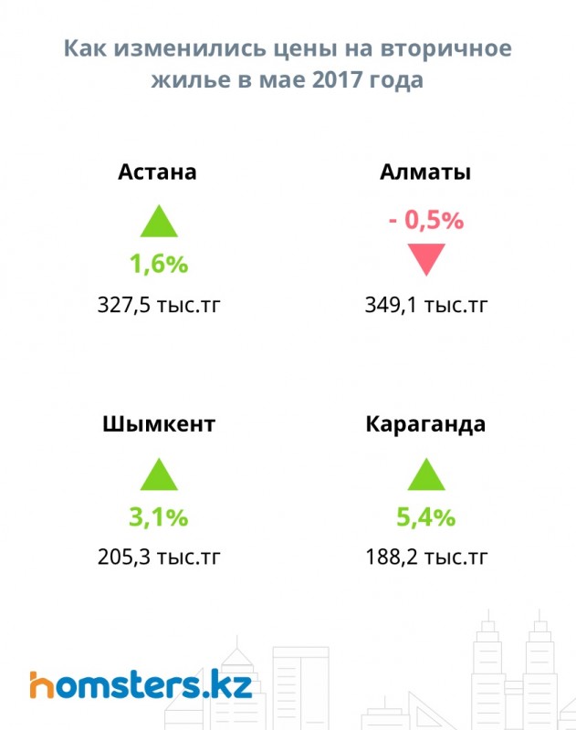 По данным аналитического центра онлайн-сервиса для покупателей недвижимости Homsters.kz, в мае цены на вторичное жилье в крупнейших городах и регионах республики продолжили расти. По данным аналитиков, средние цены на вторичную недвижимость в различных регионах показали такую динамику: в Астане цены выросли на 1,6 процента, до 327,5 тысячи тенге за квадратный метр, в Алматы снизились на 0,5 процента, до 349,1 тысячи тенге, в Шымкенте выросли на 3,1 процента, до 205,3 тысячи тенге, в Караганде также выросли на 5,4 процента, до 188,2 тысячи тенге.