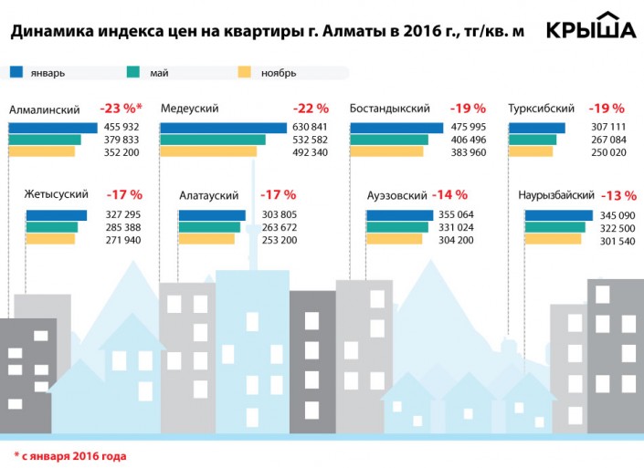 Портал Krisha.kz проанализировал данные за 11 месяцев 2016 года и выяснил, какие районы города лидировали по темпам снижения цен, а какие менее охотно адаптировались к сложной ситуации на рынке.