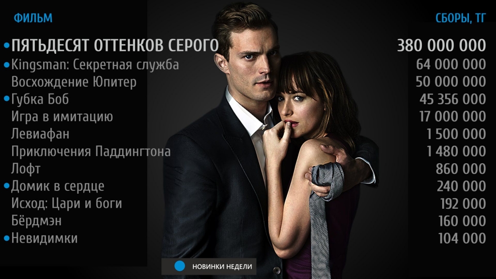 Экранизация мирового бестселлера "50 оттенков серого", премьера которой состоялась 12 февраля, за первый уик-энд проката в Казахстане собрала 380 миллионов тенге, сообщает Idea-Lab.kz. В мире в период с 12 по 15 февраля картина заработала рекордные 239 миллионов долларов, превзойдя сборы первой части саги "Сумерки", составившие 69 миллионов долларов за первые выходные.