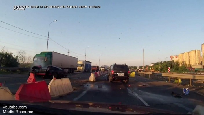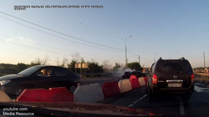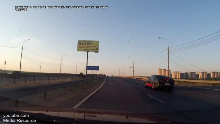 На записи с видеорегистратора видно, как спортивный автомобиль Ford Mustang на большой скорости обгоняет другие транспортные средства, а затем, не успев затормозить, врезается в дорожное ограждение на подмосковной трассе. При этом в кадре слышна фраза одного из очевидцев, что водитель и пассажир спорткара были не пристегнуты.
