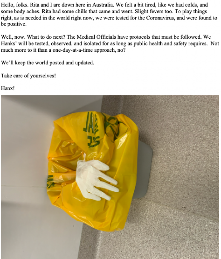 "Привет, друзья. Рита и я сейчас здесь, в Австралии. Мы почувствовали себя немного уставшими, простудившимися, и еще появилась боль в теле. У Риты время от времени был озноб. Чтобы все сделать правильно, как и нужно сейчас, нас проверили на коронавирус, и результат оказался положительным", - написал он.