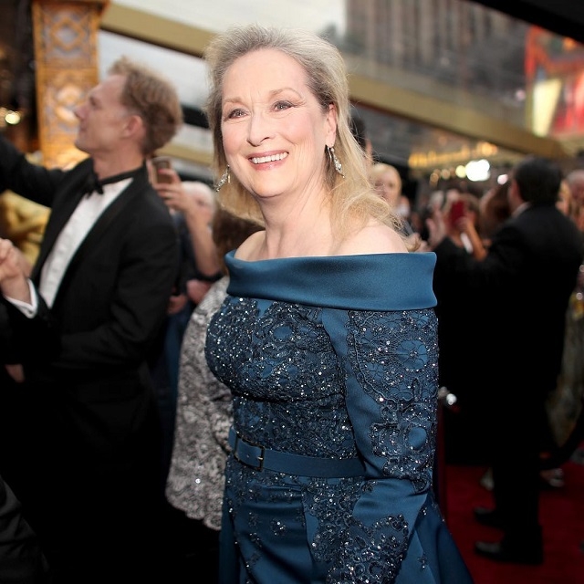 08:40 А вот и Мэрил Стрип. Все-таки, конфликт с Лагерфельдом сильно ударил по выбору 20-кратной номинантки. Стрип пришла на церемонию в платье от Elie Saab.