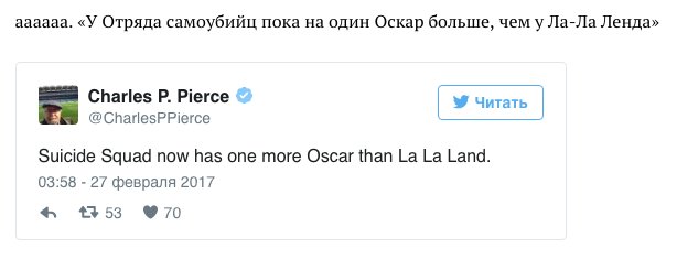 08:05 А тем временем у "Отряда самоубийц" на один "Оскар" больше, чем у "Ла-ла ленд"!