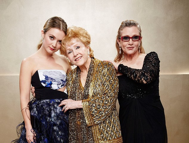 Кэрри Фишер (справа) с матерью Дебби Рейнольдс (в центре) и 24-летней дочерью Билли. Январь 2015 года. © Wirelmage