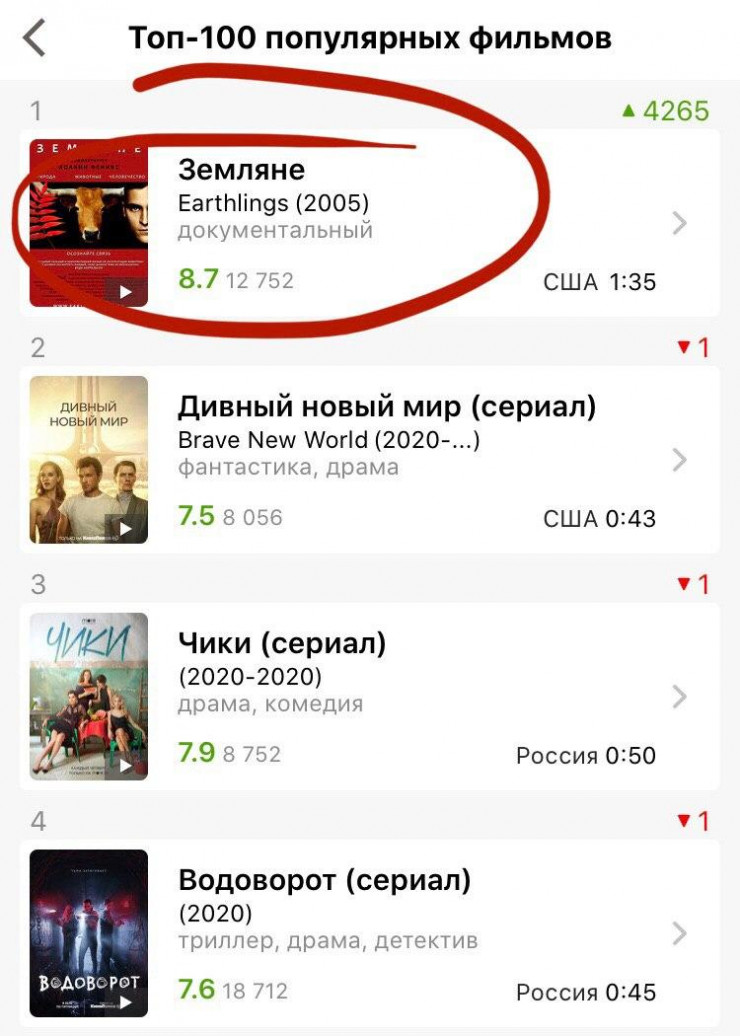 За сутки "Земляне" поднялись на 4265 позиций. Рейтинг фильма с закадровым голосом Хоакина Феникса о жестоком обращении человека с животными, в частности о происходящем на скотобойнях и в лабораториях, составляет 8,7 балла.