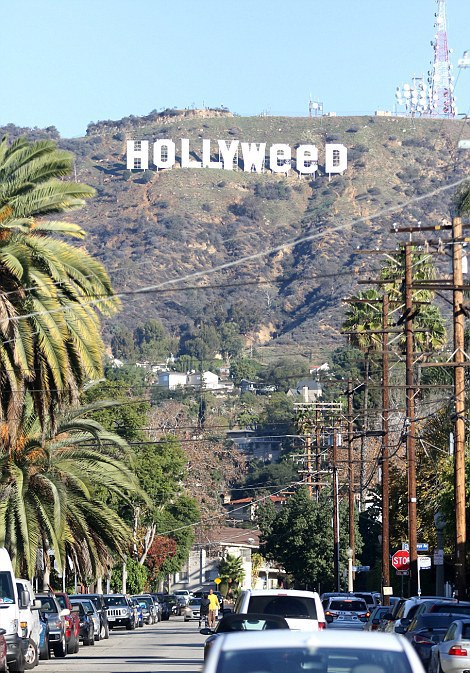 Мужчина в темной одежде, которого зафиксировали камеры наблюдения, подкорректировал надпись в Hollyweed, что можно перевести как "святая марихуана" (weed по-английски - трава в значении "марихуана"). Для замены букв на вывеске он использовал материал, похожий на брезент.