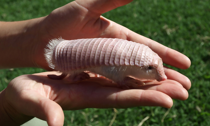 Перед вами, друзья, розовая фея, как её кличут на родине в Аргентине, или плащеносный броненосец. Копать фея умеет очень хорошо, а вот прыгать и сворачиваться – это не ёё, так что 95% времени она проводит под землёй, питаясь там червями, личинками жуков, муравьями, корнями растений, но ночами иногда выползает на поверхность чтобы для разнообразия перекусить наземными насекомыми, которых ловко находит на слух и по запаху. Глаза-то у феи мало что видят.