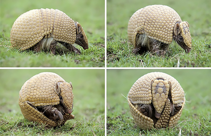 Такой манёвр могут провернуть всего два вида броненосцев – трёхпоясный и шаровидный броненосцы, а, меж тем, в семействе более 20 видов. У трёхпоясного броненосца ороговевшие пластинки костного панциря, напоминающие рыцарские доспехи, связаны между собой соединительной тканью. Это делает панцирь подвижным и позволяет зверьку в момент опасности моментально свернуться в клубок.