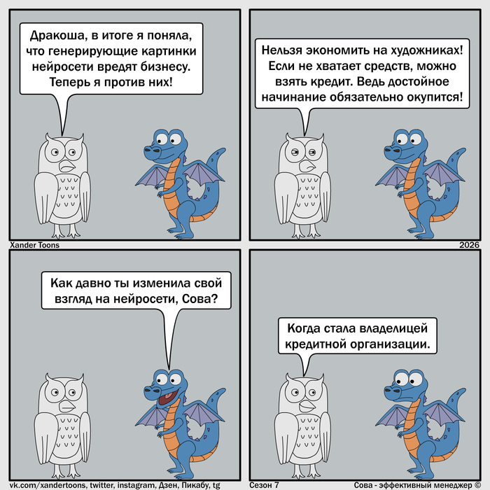 321 Xandertoons Сова говорит: "Премии не будет" Сова - эффективный менеджер Юмор "Нейросети вредят бизнесу" Сова - эффективный менеджер. Сезон 7, №135 4 дня назад Сезон 7 №135 из серии "Сова - эффективный менеджер"© За вдохновение на выпуск спасибо предпринимателям, выдающим повышение прибыли за увеличение доступности товаров для потребителей :-) Показать полностью 1 [моё] Сова - эффективный менеджер Xander Toons Комиксы Юмор Бизнес Нейронные сети 55 2 Ещё 0