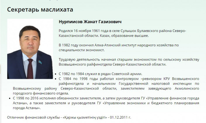 По данным сайта местного представительного органа, секретарь маслихата Жанат Нурпиисов родился 16 ноября 1961 года в селе Сулышок Булаевского района Северо-Казахстанской области. С 1998 по 2016 годы исполнял обязанности заместителя, а затем руководителя Управления финансов Астаны, а также заместителя и руководителя Управления экономики и бюджетного планирования города Астаны".