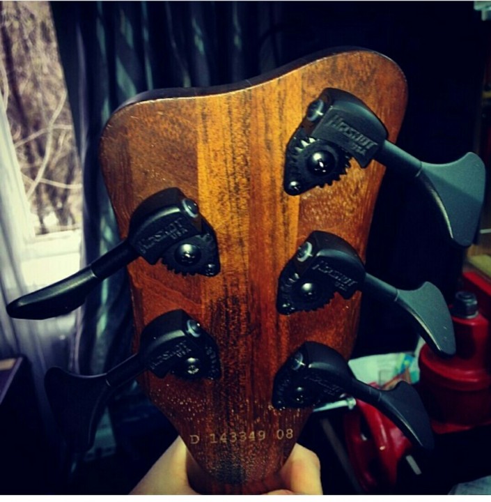 "Гитара красная, вся в потертостях, местами нет краски и гриф черный, пятиструнный, ну и чехол, "черный-моно" называется, который я видел только у одного человека. Еще колки меняные Hipshot и для ремня ушек нет, просто дырки", - описал свою гитару Сонин.