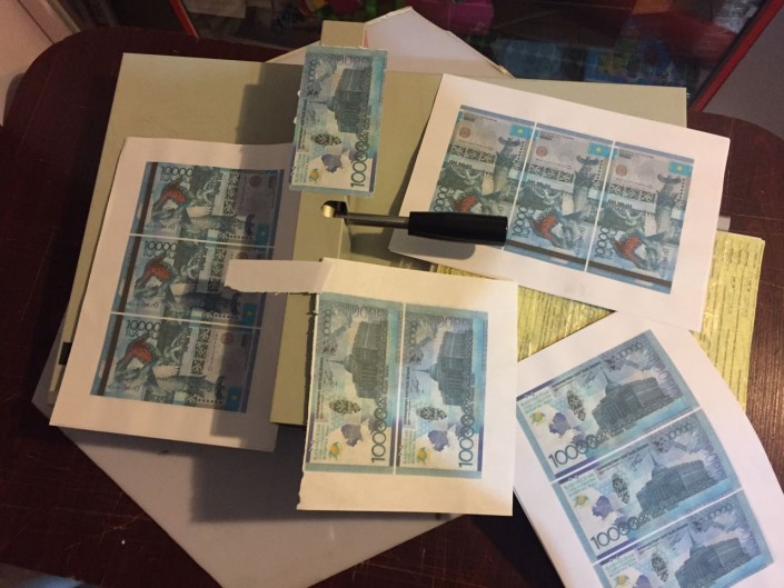В ходе обыска типографии обнаружены и изъяты фальшивые купюры с различными номерами на сумму 25 тысяч тенге, 28 листов формата А4, на которых были нанесены цветным принтером формы купюр номиналами 1000, 2000, 10 000 тенге, специальные бумаги, а также цветные принтеры и компьютеры.