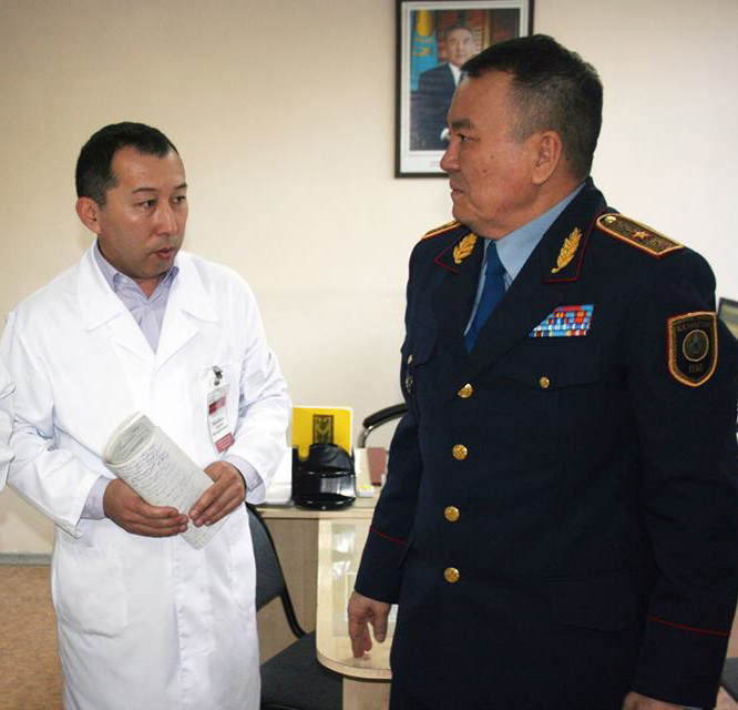 Главный врач Мадина Ермаханбетова пояснила, что сейчас здоровью полицейского ничего не угрожает. "Оперативных вмешательств не было, лечение консервативное. Сейчас у него состояние стабильное. Если никаких осложнений не будет, он пролежит в больнице до двух недель. Ранение в бедренную область справа. Диагноз - огнестрельное множественное ранение подвздошной области бедра с правой стороны. Травматический шок второй степени". Вся необходимая помощь была оказана в районной больнице ночью. Пять дробинок остались в мышцах, одна дробинка была снаружи, ее полицейские приобщили к делу. Пять дробинок сейчас находятся внутри, но они в мышцах. Не в кости, не в сосуде, в мышцах", - сказала она.