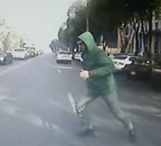 Двое из них пытаются выхватить у своих оппонентов предмет, похожий на сумку. При этом мужчина в черной куртке размахивает предметом, похожим на оружие. В итоге двое нападавших убегают, пробегая прямо перед транспортом с камерой.