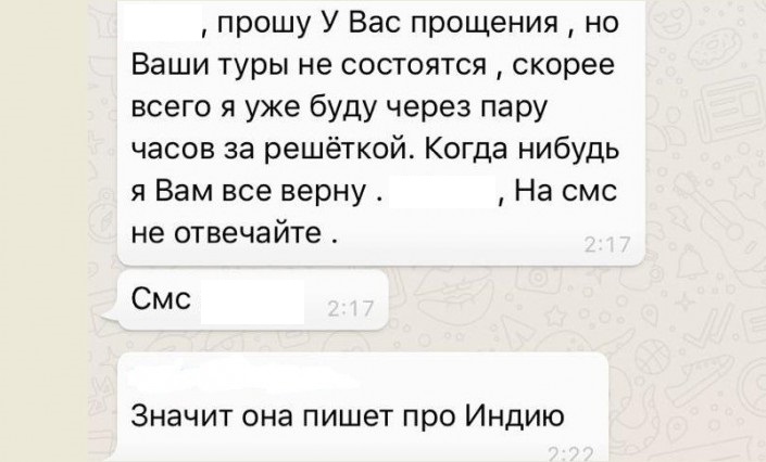 Фото этой переписки опубликовала в Facebook другая женщина, рассказав о том, что приключилось с ее знакомыми. По ее словам, они собирались полететь в Индию, но за сутки до путешествия получили данное сообщение.