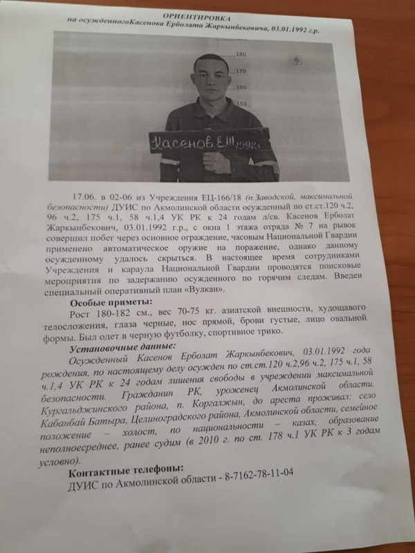 Ночью 17 июня из учреждения ЕЦ-165/18 в Степногорске совершил побег осужденный за тяжкое преступление  Ерболат Касенов. Как говорилось в распространенной ориентировке, часовой открыл огонь из автоматического оружия, однако заключенному удалось уйти. Мужчину удалось задержать в воскресенье во второй половине дня.