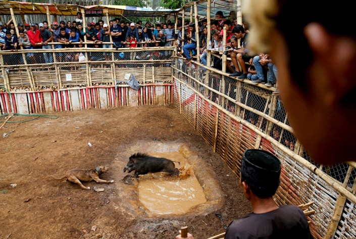 Жестокие бои питбулей с дикими кабанами показали журналистам © Reuters/Beawiharta Beawiharta