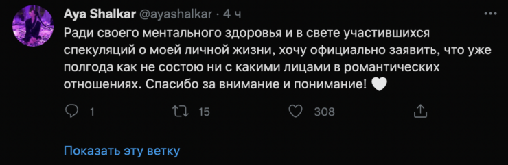 Парень официально объявил об отношениях у Юрия Дудя в 2019 году. Однако в январе 2022 году Айя написала в своем твиттер-аккаунте, что уже 6 месяцев не состоит в отношениях.
