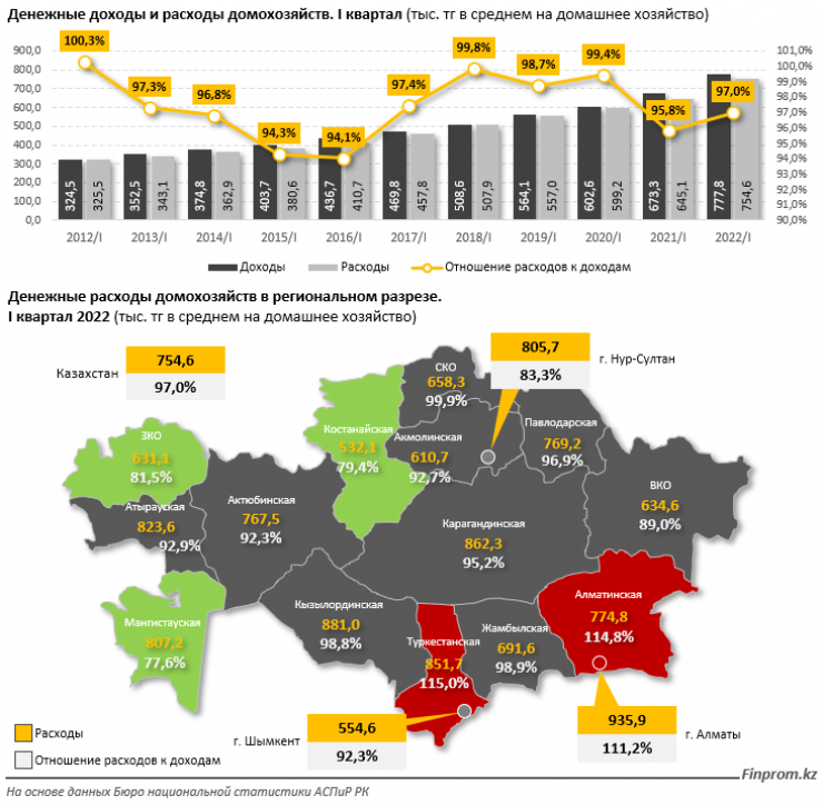 Среди регионов самые высокие расходы в первом квартале 2022 года наблюдались у домохозяйств Алматы (935,9 тысячи тенге), следом идут Кызылординская (881 тысяча тенге в среднем на одно домохозяйство) и Карагандинская (862,3 тысячи) области.