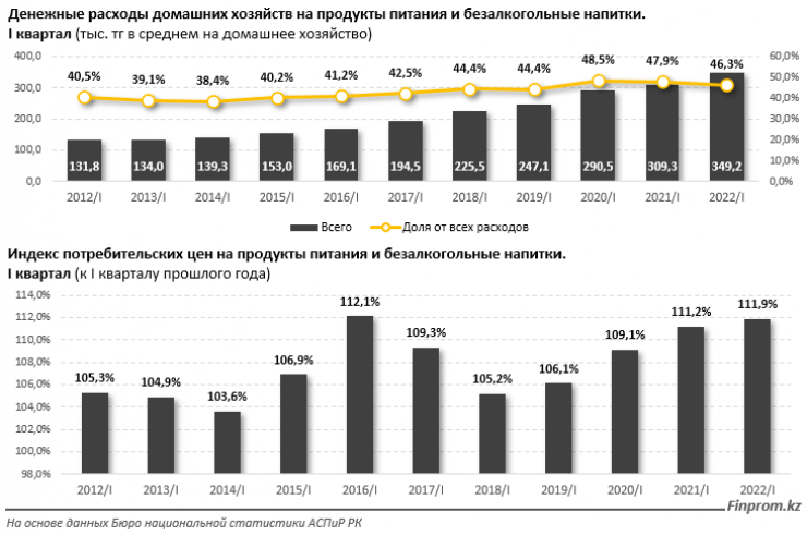 В первом квартале 2022 года 50 процентов расходов казахстанских семей уходило на продовольственные товары, причем 46 процентов - непосредственно на еду, сообщает Tengrinews.kz со ссылкой на Finprom.kz