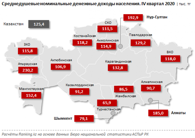 Среди регионов страны среднедушевые номинальные денежные доходы в четвертом квартале 2020 года варьировались от 65,9 тысячи тенге в Туркестанской области до 230,2 тысячи тенге в Атырауской. При этом в реальном выражении доходы в Атырауской области уменьшились на два процента, в то время как в Туркестанской выросли на 7,4 процента.
