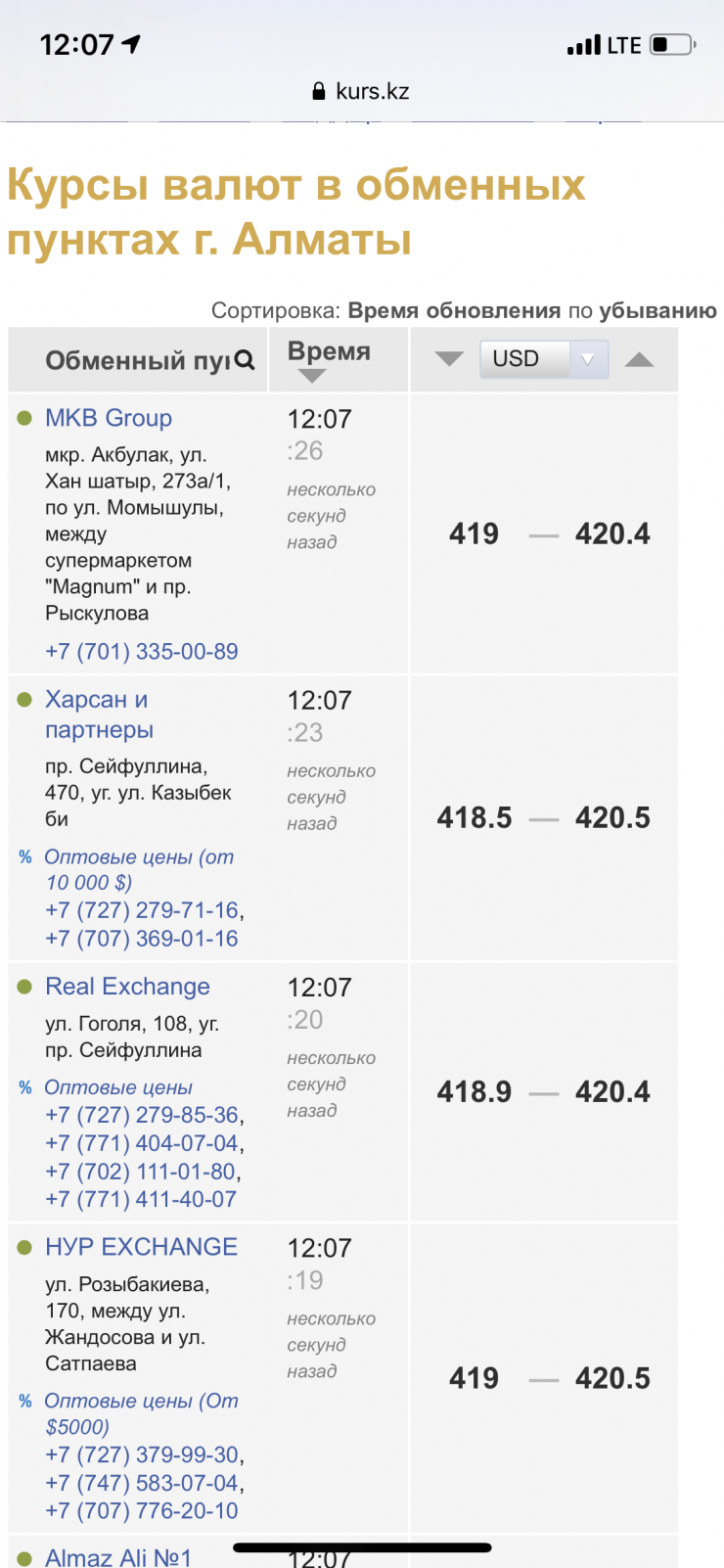 По данным kurs.kz, в обменных пунктах Нур-Султана максимальный курс продажи американской валюты на 12.00 составляет 420 тенге, в Алматы - 421 тенге.