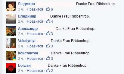 Пользователи Интернета, в основном украинские, начали массово оставлять на официальной странице канцлера Германии Ангелы Меркель в Facebooк комментарии с одной и той же фразой, состоящей из трех слов: Danke, Frau Ribbentrop ("Спасибо, госпожа Риббентроп"), сообщает BBC News. Таким образом, пользователи выражают недовольство позицией Меркель, сравнивая ее с министром иностранных дел фашистской Германии и советником Гитлера по внешней политике Иоахимом фон Риббентропом.