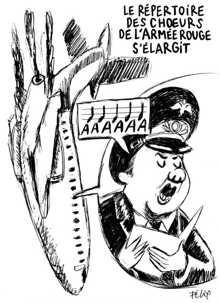 На рисунке изображен самолет, падающий вертикально, и военный, который находится внутри и произносит звук "а-а-а-а". "Репертуар военного хора расширяется", - подписана карикатура.