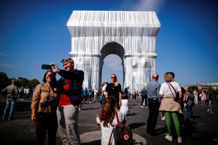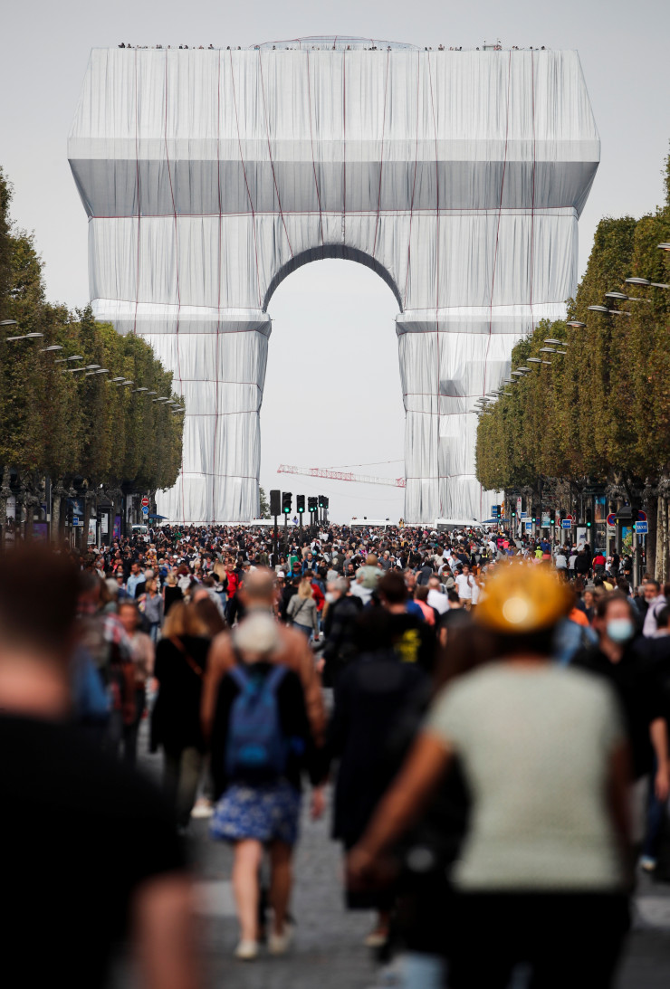 Пешеходы, прогуливающиеся по самой известной улице Парижа, могли увидеть Триумфальную арку, представленную на этот раз как художественная инсталляция. Памятник был покрыт серебристо-голубой тканью в рамках посмертной выставки покойного художника Христо Явашева.