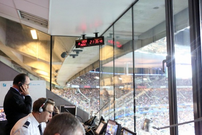 Помимо Олланда на стадионе в момент нападения присутствовали также глава МИД ФРГ Франк-Вальтер Штайнмаейр. Один из взрывов, прогремевших около стадиона, был настолько силен, что его услышали на самом стадионе - этот момент произошел примерно в 21.17 по местному времени. Сообщалось, что главу государства немедленно эвакуировали в безопасное место. Однако на другой фотографии видно, как Олланд говорит по телефону в помещении службы безопасности стадиона, на часах в этот момент 21.36.