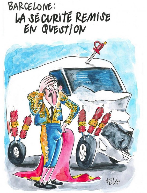 На рисунке, размещенном на сайте издания, запечатлен белый фургон с помятым капотом. Рядом с ним, держась за голову и сжимая в руке красное полотнище, стоит тореадор. В шины и крышу автомобиля воткнуты шпага и пики - инструменты участников корриды. "Барселона: безопасность снова под вопросом" - такая надпись сопровождает карикатуру.