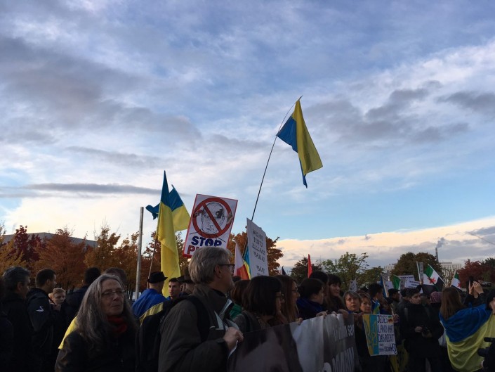 "Путин является главным спонсором войны на Украине и спонсором террористов. Мы выступаем против этого. Мы хотим остановить войну. Если бы не было оружия и наемников, то никакой войны в Донбассе бы не было", - заявил участник акции протестов Павел Литковский. По его словам, сам он родом из Украины, уже два года живет в столице Германии.