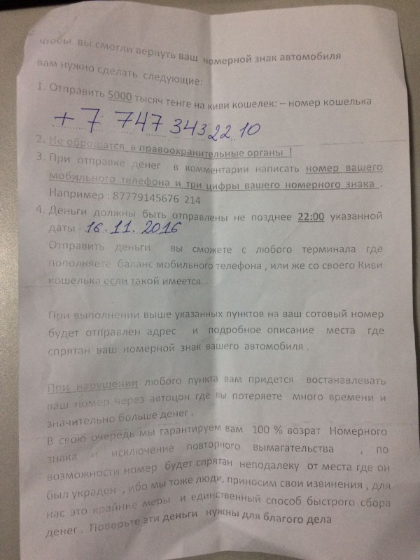 Напомним, в апреле 2014 года студент режиссерского факультета в Алматы попался на вымогательстве денег. Он воровал автомобильные номера и требовал у хозяев перечислить деньги за возврат на указанный счет. Сумма варьировалась от четырех до пяти тысяч тенге. Записки с требованиями, адресованные потерпевшим, студент заканчивал фразой: "Если вы хотите узнать обо мне, то подождите полгода, и я отправлю видеоотчет обо мне!!!" А в марте 2015-го серия аналогичных преступлений произошла в  Уральске.