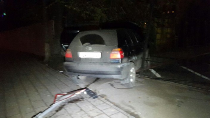 Инцидент произошел по проспекту Райымбека на восток, не доезжая улицы Саина. Со слов очевидцев, водитель авто марки Volkswagen Golf не справился с управлением, автомобиль снес знак, перелетел через арык и врезался в забор.