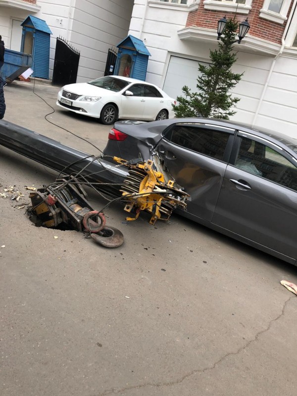 Очевидцы записали видео с места происшествия. На кадрах видно, как автокран XCMG лежит кабиной вверх. Рядом стоит легковое авто с помятым крылом. Часть упавшего крана повредила асфальт. Вокруг техники стоят рабочие в касках.