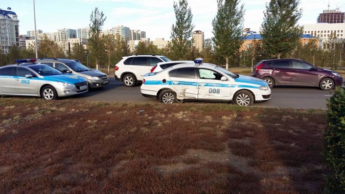 Пользователь Facebook Тимур Асылханов опубликовал на своей странице фото с места столкновения машины дорожного патруля и внедорожника.