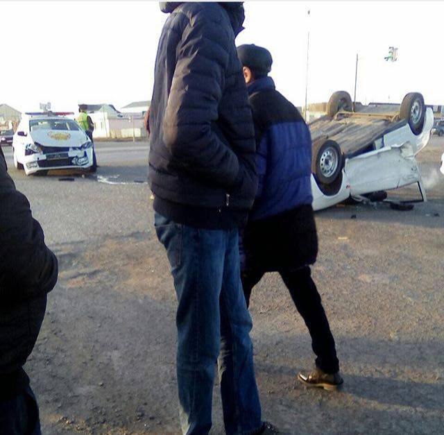 ДТП произошло вечером 12 марта в районе автомобильного моста, соединяющего микрорайоны "Жумыскер" и "Балыкши". Столкнулись автомобиль Volkswagen Polo, в котором ехали дорожные полицейские, и Lada Priora. От сильного удара вторая машина перевернулась.