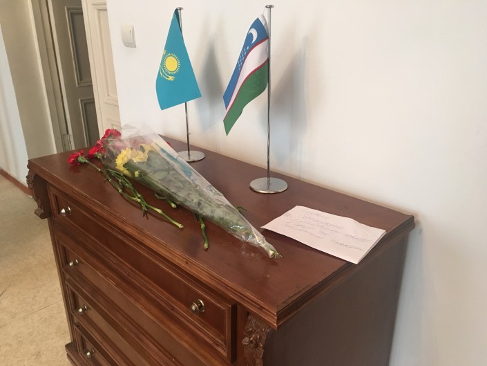 Как сообщили сотрудники посольства, со вчерашнего дня приходят неравнодушные жители города, выражают соболезнования и оставляют цветы. Вчера пришли 10 студентов алматинских вузов. Однако сегодня с утра пришел лишь один человек.