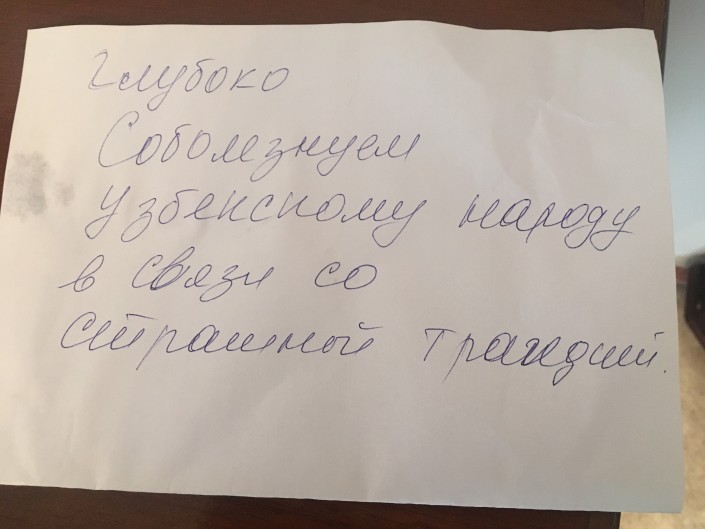 В посольстве сообщили, что книгу соболезнований выставлять не стали, но посетители все равно оставили слова соболезнования на простой бумаге.