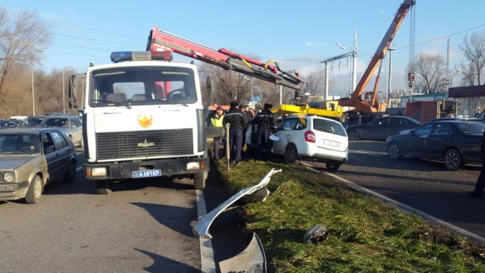 Груженый песчано-гравийной смесью "КамАЗ" и Lаda Kаlina двигались по проспекту Рыскулова в восточном направлении. По неизвестным причинам произошло столкновение большегруза и легкового авто. По всей видимости, от удара "КамАЗ" опрокинулся и содержимое кузова высыпалось на асфальт.