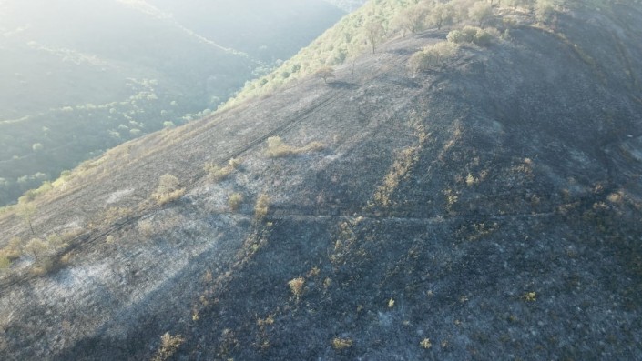 Площадь в несколько квадратных километров выгорела полностью. В глаза бросается "облысевший" и почерневший склон.