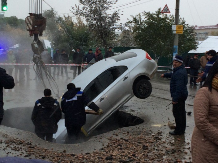 Напомним, 4 октября в Петропавловске в яму посреди дороги упали два авто. Одно из них эвакуировали с помощью спецтехники.