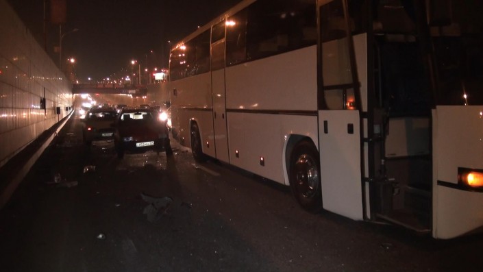 Буквально через 30 минут также на улице Саина из-за пробки, образовавшейся из-за предыдущей аварии, произошло еще одно ДТП. На север по Саина двигались автобус, Volkswagen Passat, Subaru Outback и Subaru Forester. По словам очевидцев, водители автобуса, Volkswagen Passat и Subaru Outback остановились из-за образовавшейся пробки, а водитель Subaru Forester не заметил ее и на высокой скорости, пытаясь избежать ДТП, взял правее и в итоге пролетел между Volkswagen и туннелем развязки, влетел в туннель и перевернулся. Volkswagen и Subaru Outback после удара врезались в автобус. В результате аварии пострадал пассажир Subaru Forester.