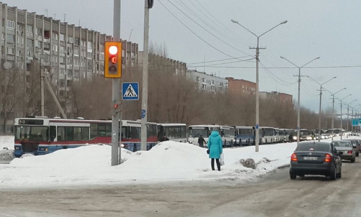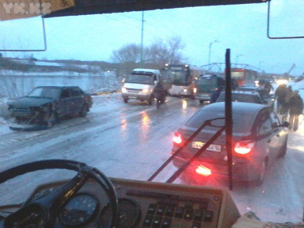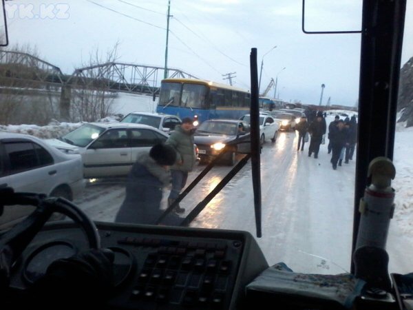 Между тем, в городе образовалась одна из самых протяженных автобусных пробок за последние несколько лет. Из-за скользкой трассы общественный транспорт застрял на льду. Огромная пробка в несколько сотен метров растянулась на проспекте в районе Левобережья. Около двух десятков автобусов встали один за другим, будучи не в состоянии двигаться на небольшой пригорок из-за чрезвычайно скользкой трассы. Сотни горожан опоздали на работу. В ситуацию уже вмешались местные власти.
