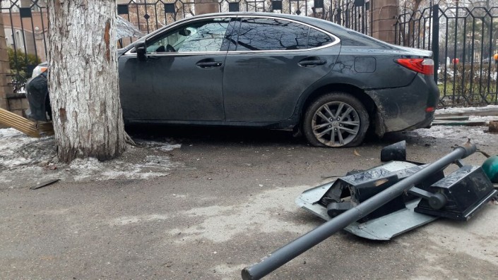 Перед ним остановилась машина, которую водитель решил обогнать справа, резко дал по газам, Lexus сразу же занесло: автомобиль снес светофор, два маленьких металлических столба и остановился между деревом и забором. Жертв и пострадавших нет.