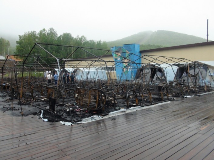 По данным российских СМИ, пожар в детском лагере на территории горнолыжного комплекса "Холдоми" в Солнечном муниципальном районе Хабаровского края вспыхнул в 02.34 часа по местному времени. РИА Новости пишет, что 20 из 26 палаток сгорели менее чем за 30 минут. Общая площадь пожара составила около 2,4 тысячи квадратных метров. В лагере находилось 189 детей. Один ребенок погиб сразу, еще шестерых госпитализировали. Позже в больнице от ожогов скончались еще трое детей.