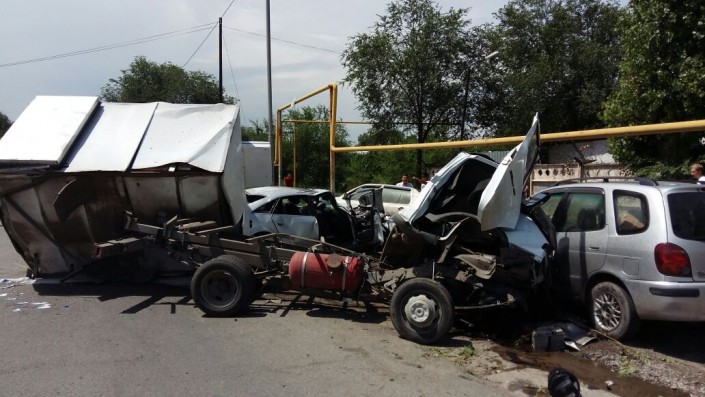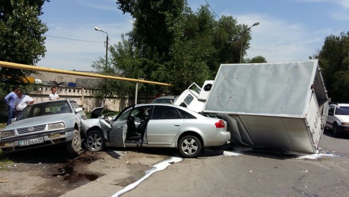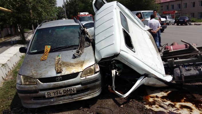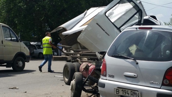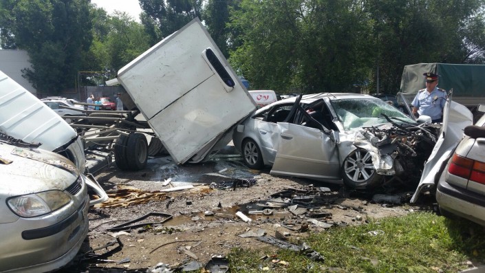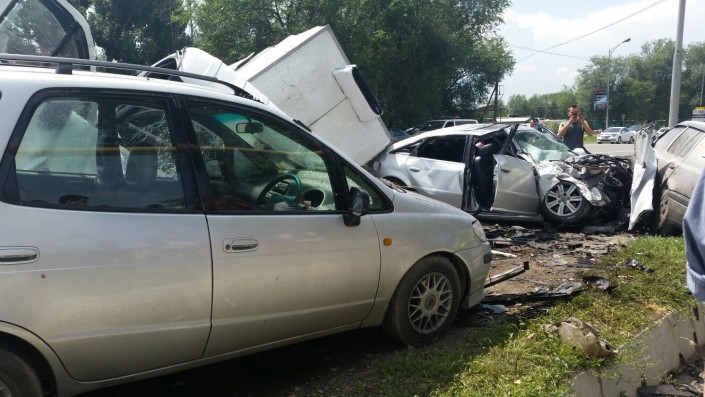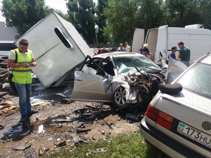 По информации корреспондента программы "Территория происшествий" телеканала СТВ, водитель Audi, двигавшийся по проспекту Суюнбая, нарушил ПДД и проигнорировал требования полицейских остановиться. Сотрудники полиции, по словам очевидцев, начали погоню за нарушителем. В это время автомобиль ГАЗель стоял на повороте налево по проспекту Суюнбая, ниже улицы Бокейханова. Во время поворота ГАЗель задел Audi, обгонявшую грузовое авто по встречной полосе. От удара автомобили отлетели на припаркованные Toyota и Volkswagen.